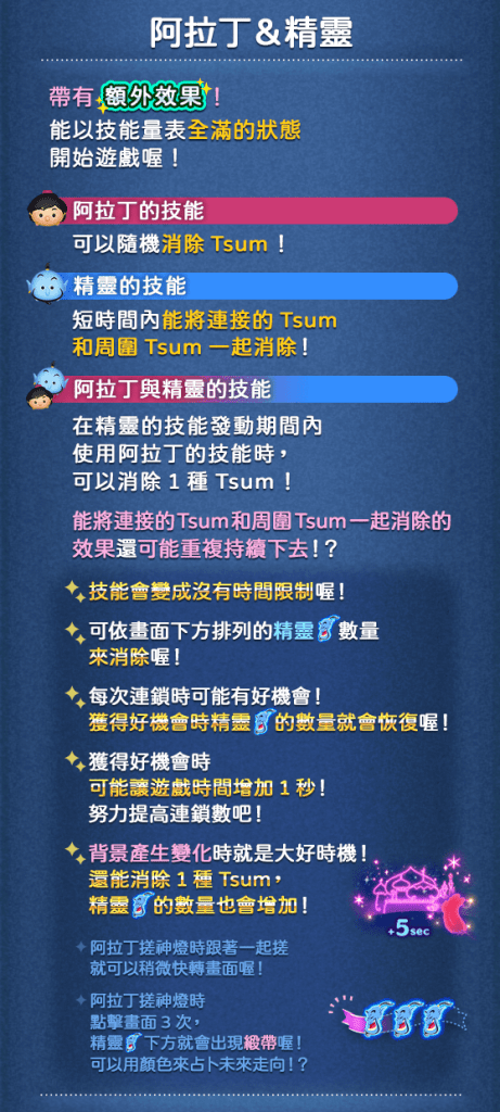 | 4 | 次數:3(組合技) | 消除數量:20(阿拉丁) | 時間:5.2 秒(精靈) |